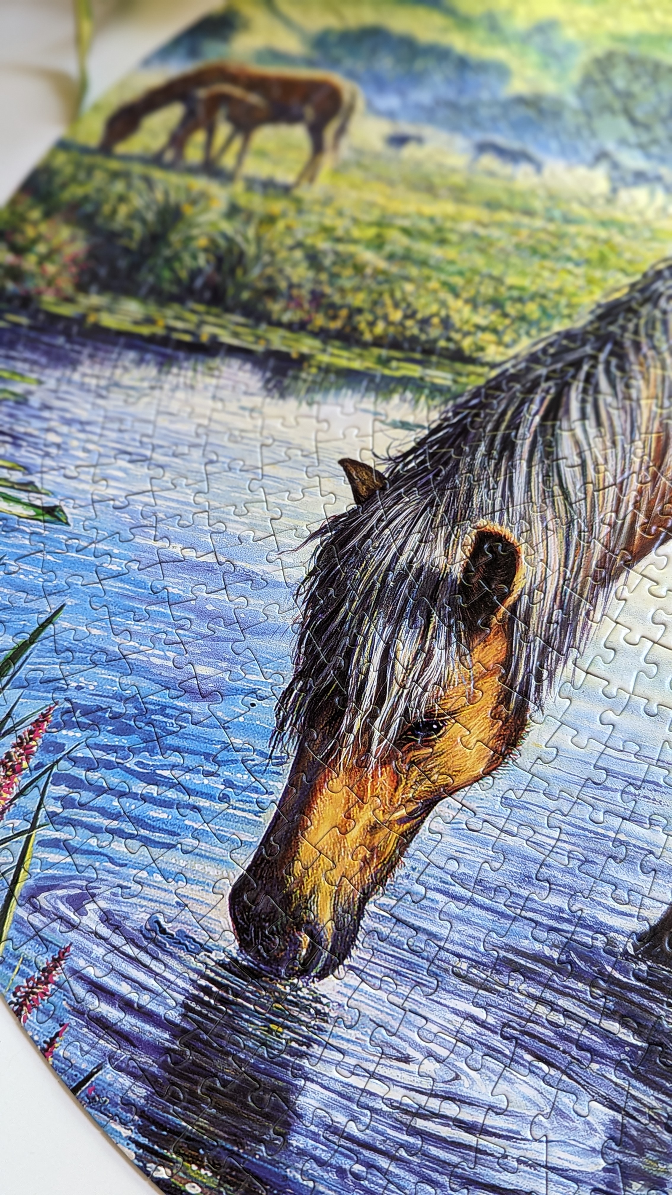 One thing I didn’t realize when starting this puzzle is that the artwork is mostly made up of textures. There are essentially 4 different textures – water, fur, trees and grass. When broken down into individual pieces, these textures were quite hard to place. Basically, the only well-defined edges were the little yellow flowers at the bottom of the puzzle. Everything else was just one texture blending into another. If you’ve ever struggled to put together a puzzle with a lot of fur, it was a bit like that but on the entire puzzle.