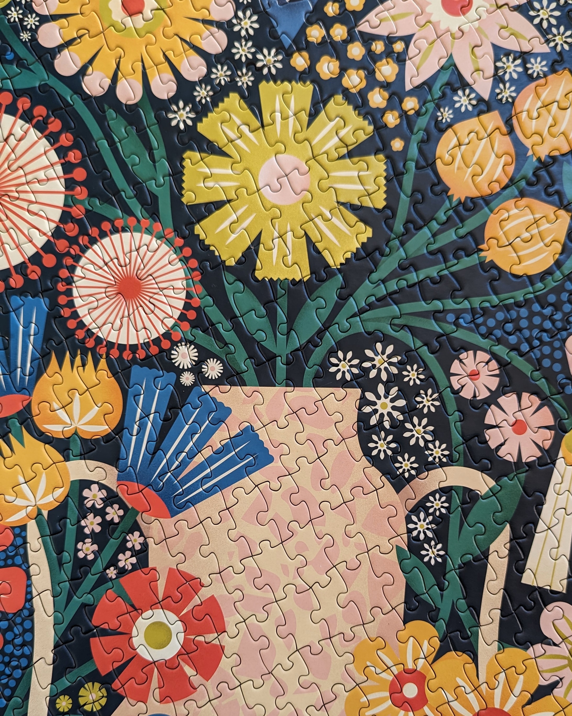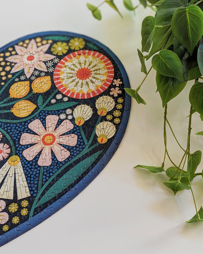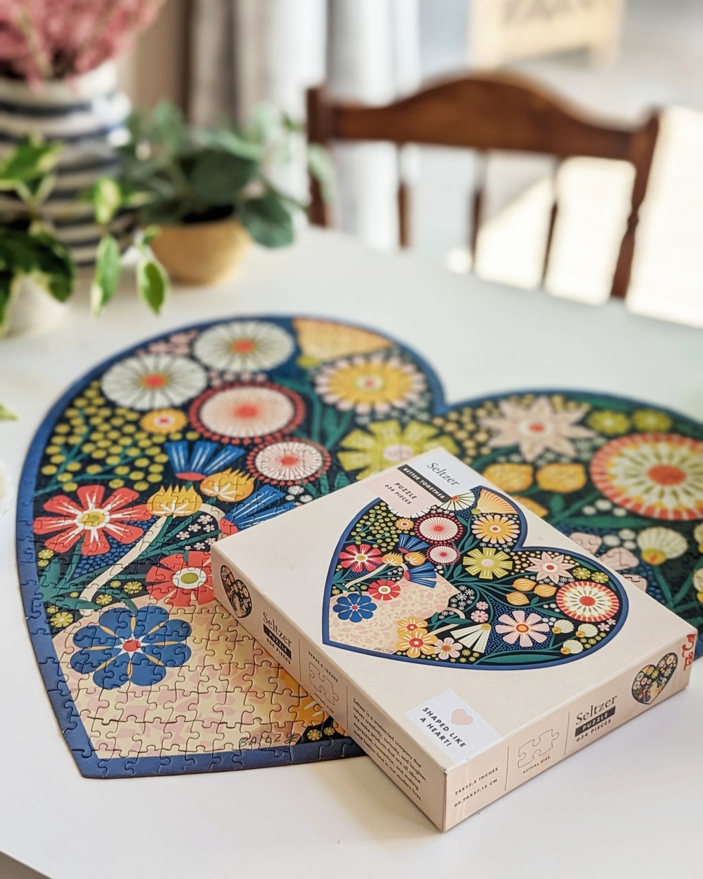 In terms of difficulty, this puzzle was certainly on the easier side. There were some places which were more difficult, like the vase with its soft abstract pattern, but I found that sorting the pieces by shape made it very manageable. I left the outer edge to the end (and actually, my husband completed most of that) since it was primarily solid blue and the unique nature of the piece shapes due to the overall heart shape made it harder to tell where pieces would go. I do think that someone could do the edge first on a puzzle like this, but for me, I felt it was going to be overall easier to do at the end.