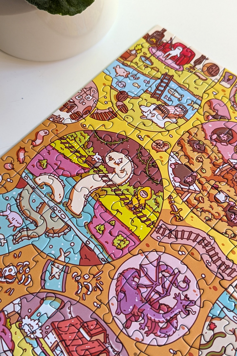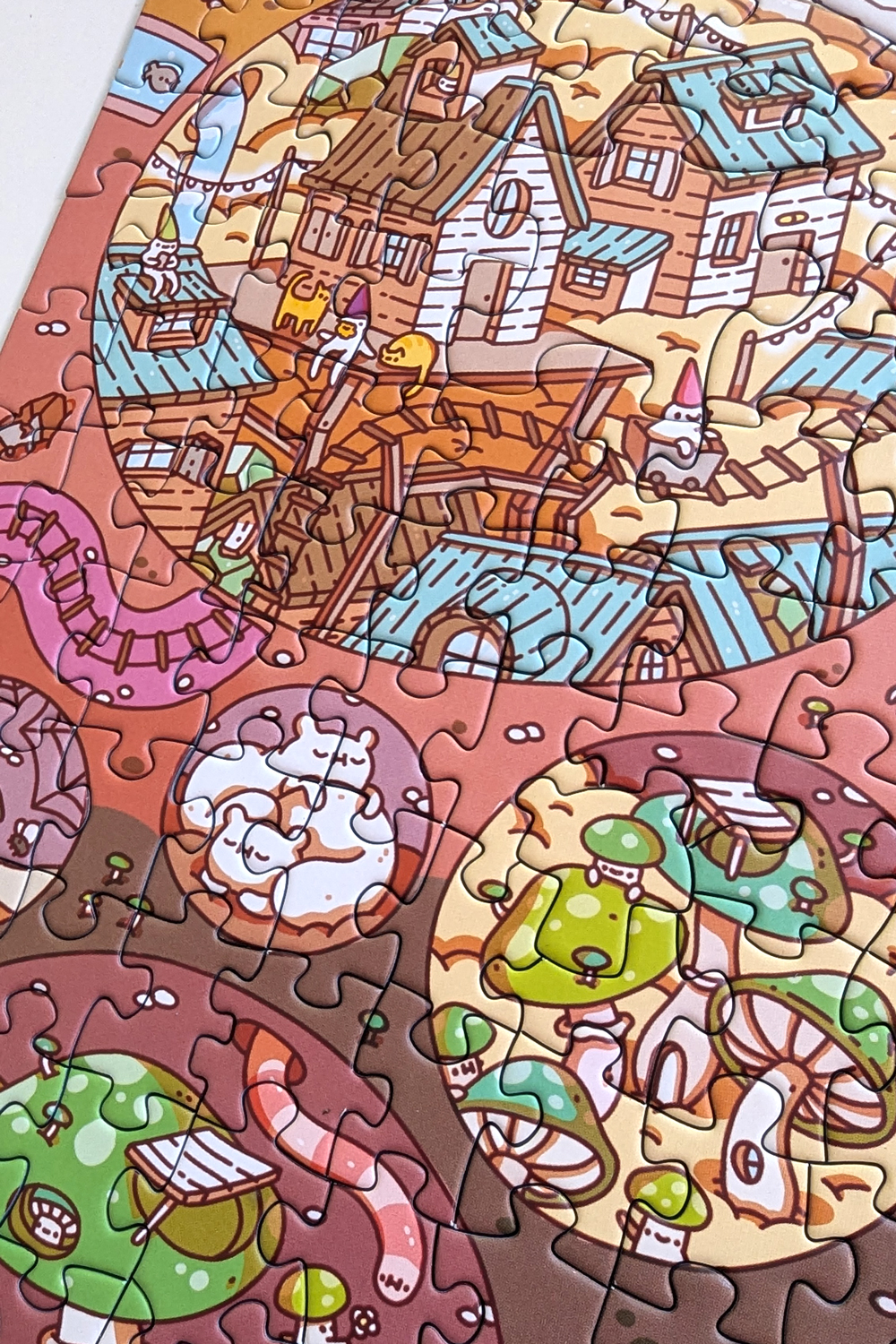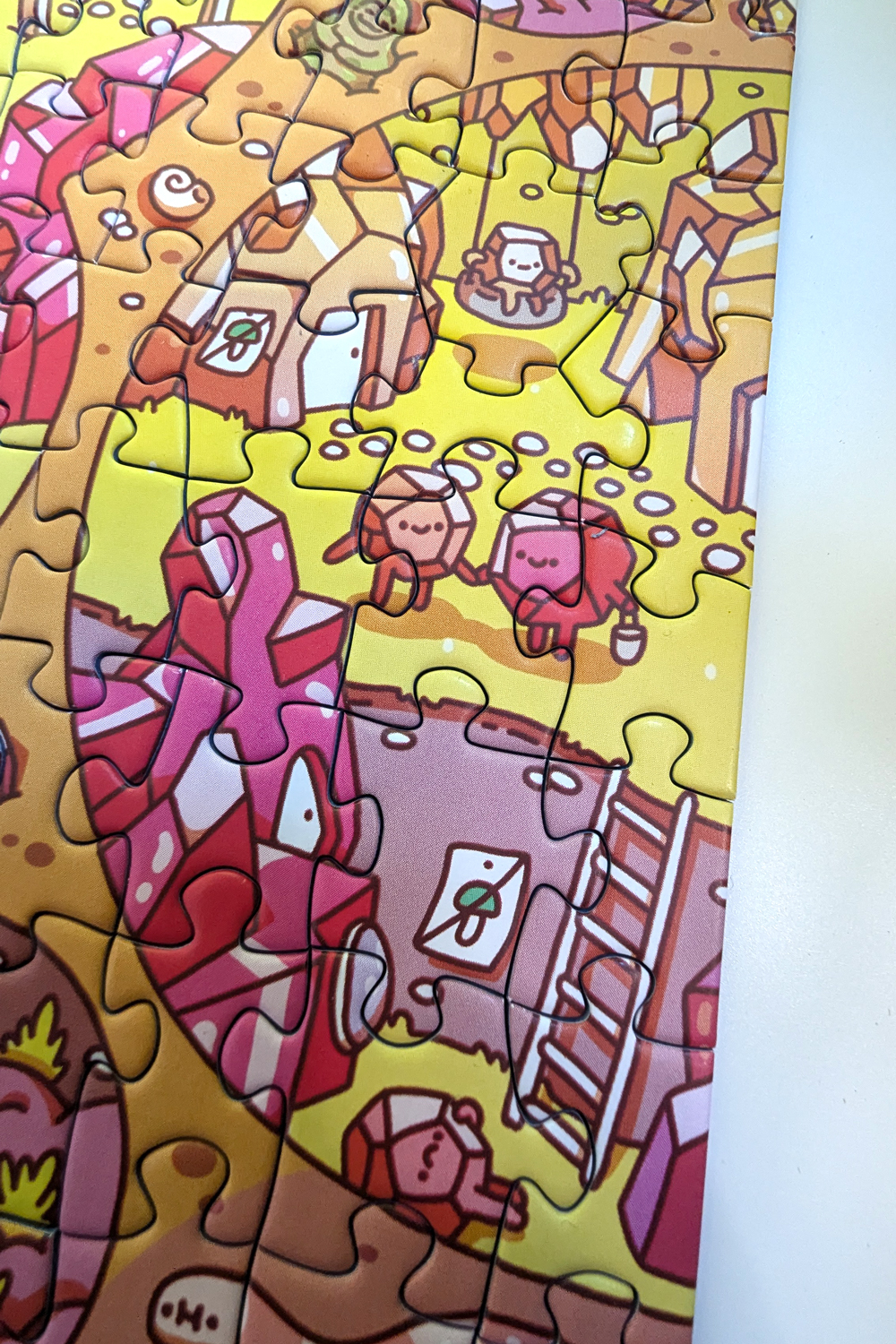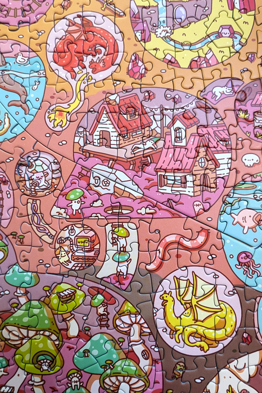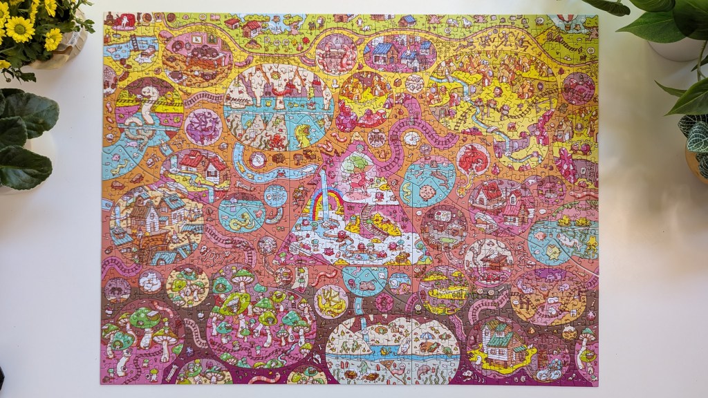 Speaking of the artwork, the artist Odsanyu did an incredible job. This particular puzzle was really fun to look at. The scene comprises a side view of mostly underground caves and a network of tunnels. The caves are filled with different scenes of living spaces, pools, mythical and weird creatures, and the dwellings of a few unique species (gem people, mushroom people, and, for lack of a better description, tiny little gnome like humanoids). As you look upon the scene, you begin to realize that there is a conflict of some sort between the different species. In one cavern, the gem people have imprisoned a mushroom person, and they have posted signs indicating they don’t want mushroom people around. It’s super fun to look at and wonderfully detailed. Every time I look at it, I see something new that I never noticed before. It’s fantastically colorful, including the areas surrounding the caves and caverns which creates a gorgeous rainbow gradient of bright pinks, greens, purples and yellows. The whole puzzle was stunning to look at and put together.