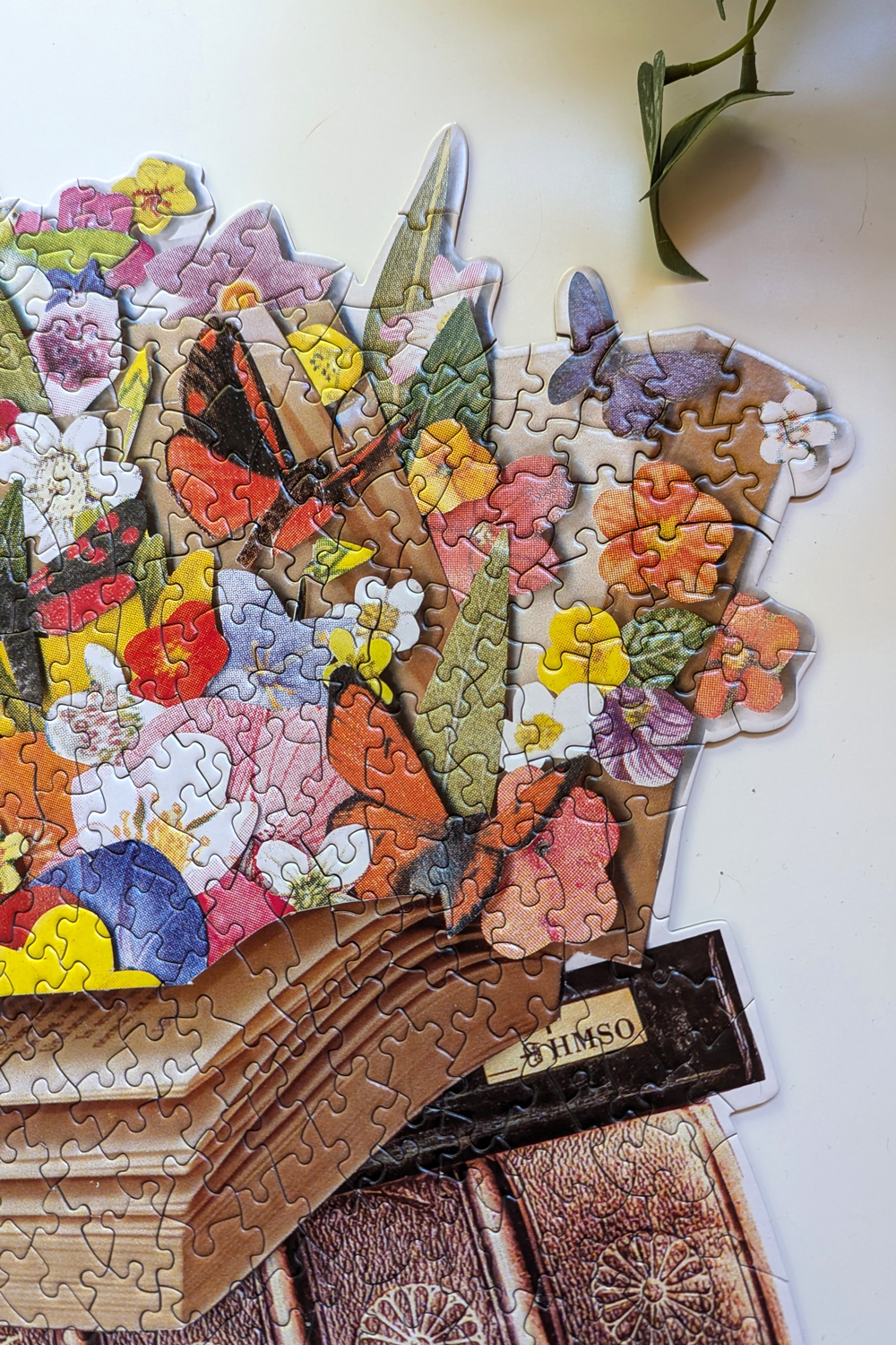 As I progressed, the puzzle revealed more of its charm. The vibrant flowers and beautiful butterfly designs contrasted with the vintage books, making each completed section a visual treat. The challenge of the random cut pieces added to the fun, requiring a keen eye and a bit of patience to fit everything together just right. I will note, that several of the pieces were a “push fit” on one side, which means that they were cut with a smooth edge that would butt up against another piece rather than interlock. This could be frustrating at times because until the pieces surrounding it were interlocked it was quite easy to accidentally nudge the two pieces apart. There was one section of the puzzle that I nudged out of place probably 8 times. It also made moving those sections a little difficult as they had to be slid across the table rather than picked up.