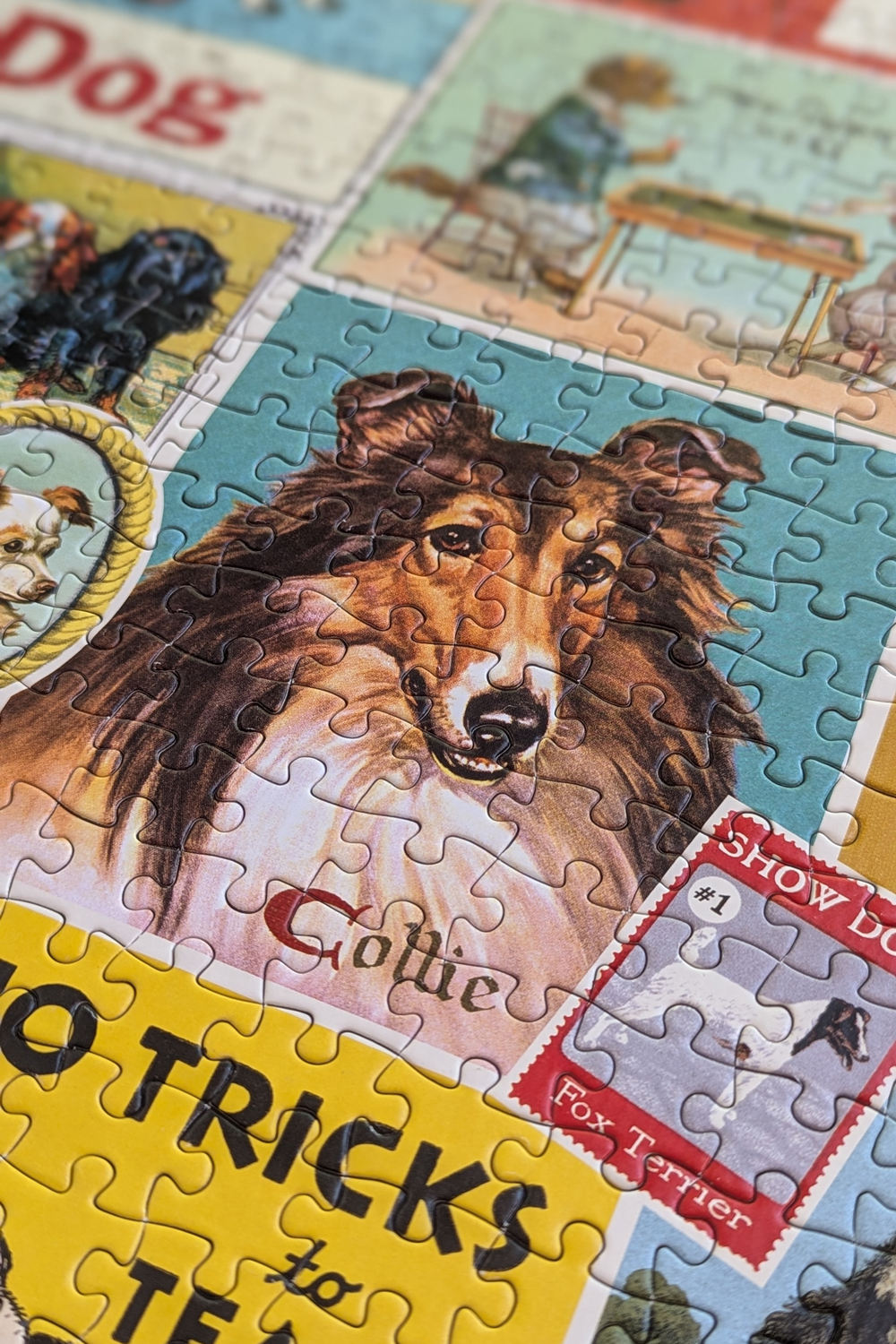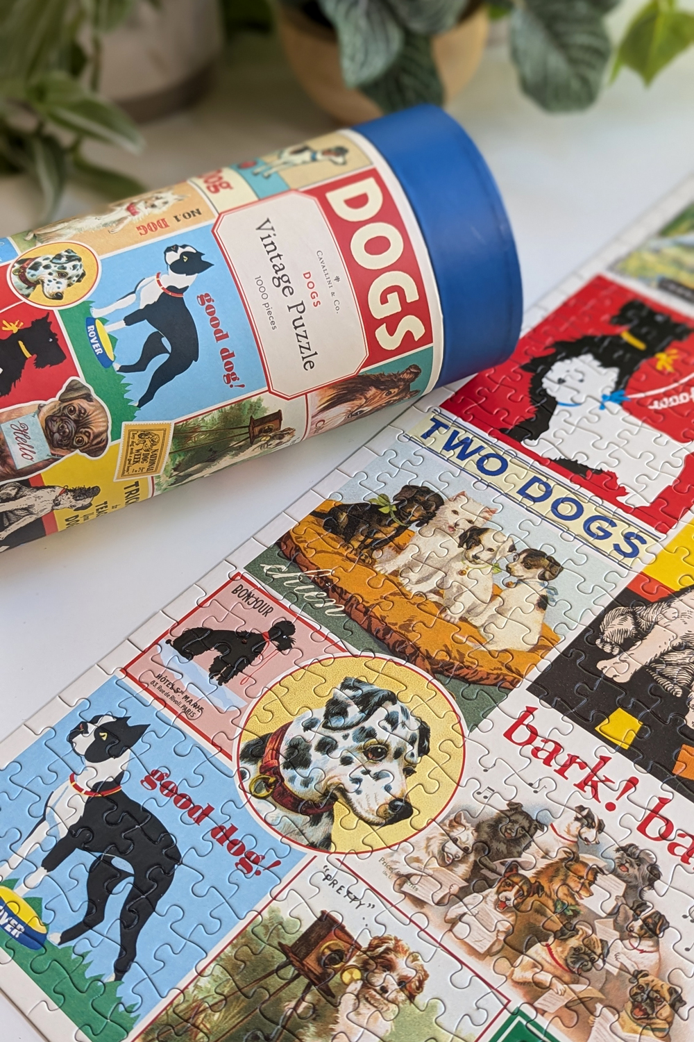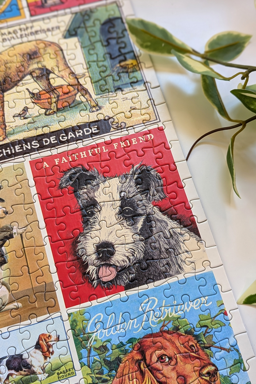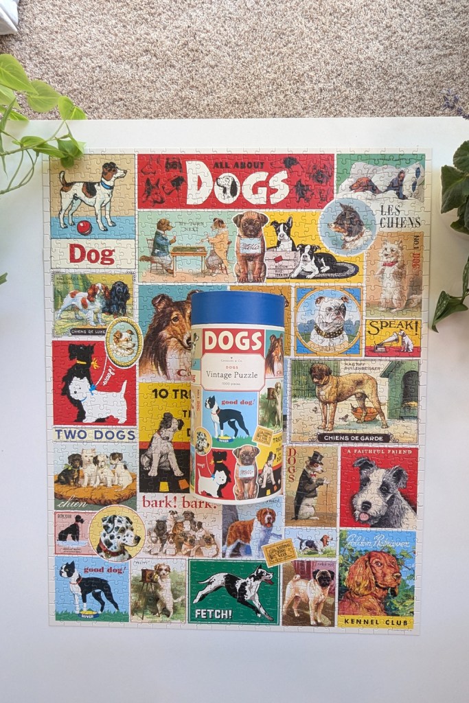 There is something about the round tube containers of the Cavallini Papers & Co. puzzles that always draws me in when I find them in a store. Coupled with the gorgeous vintage artwork, I almost always stop and look at them when I come across them. I’ve purchased three Cavallini puzzles and, until this week, had yet to do any of them. 😅 One of them is more of a winter scene, so I’m waiting until later in the year to take it on. The second is certainly a summer-themed puzzle, and I’m likely to work on it in the next few weeks. The final Cavallini puzzle I own is the one in this week’s video. It is simply called ‘Dogs’ and features a patchwork of different dog-themed vintage artwork. I found this puzzle last week at my local library’s monthly sale and immediately wanted to put it together.