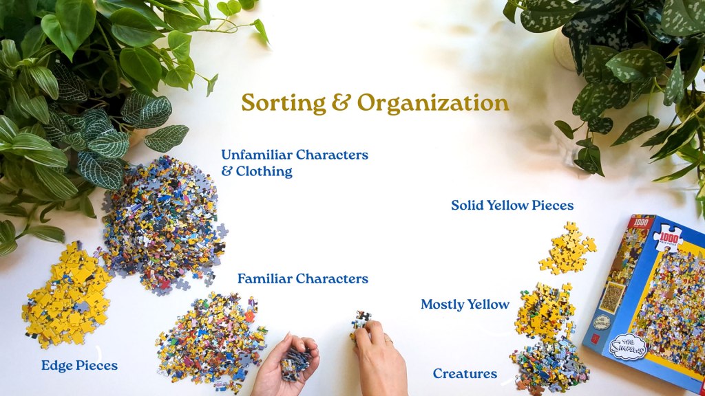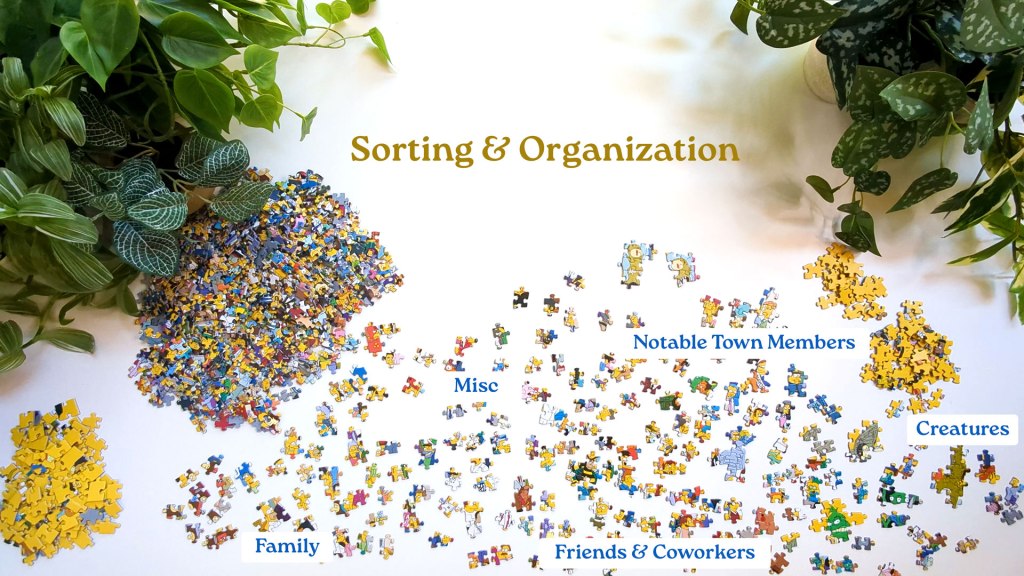 I used a few organizational tricks beyond sorting by familiar elements. Early on, I placed the characters in certain locations on my table based on their relationship to the main characters in the show. Direct Simpsons family members were placed off to the left. This puzzle includes not only the main family members as you have come to know them but also the different variations as well, like the original style of artwork from the first episode. School-related characters (teachers, classmates, bullies, staff, and superintendents) were placed directly in front of me. Friends of the family and coworkers were placed off to my right, and above that, I put important town figures. I had a small pile for animals and creatures (elves, monsters, aliens) further to my right. This layout was successful for building individual characters as I could spot the exact character I was working on much quicker. It started to break down once I ran out of space and needed to place the characters approximately where they were going to end up.