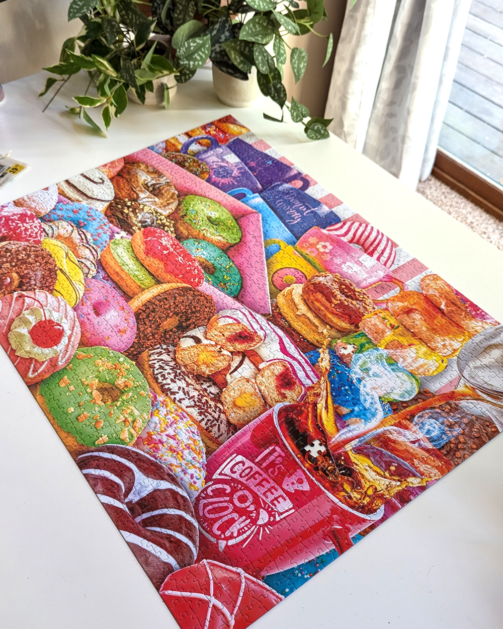 If you watch the time-lapse video of this puzzle on my YouTube channel, when my husband first joined me you can see he started on the purple and blue coffee mugs and absolutely zoomed through that section. At that time, I was working on the green frosted donuts and you can see that this section held me up a little as I barely finished any of that as my husband completed his entire purple section. I have a habit of focusing too hard on whatever I’m working on rather than taking a break and switching to a different section and coming back to the original later. Whenever I do actually switch sections and inevitably move quicker through the next section, I’m reminded that I really need to work on being more flexible when I come across a challenging section. We continued through the different sections, my husband working on most of the coffee-related elements and myself working on the donuts, and before I realized it we were putting in the last piece.