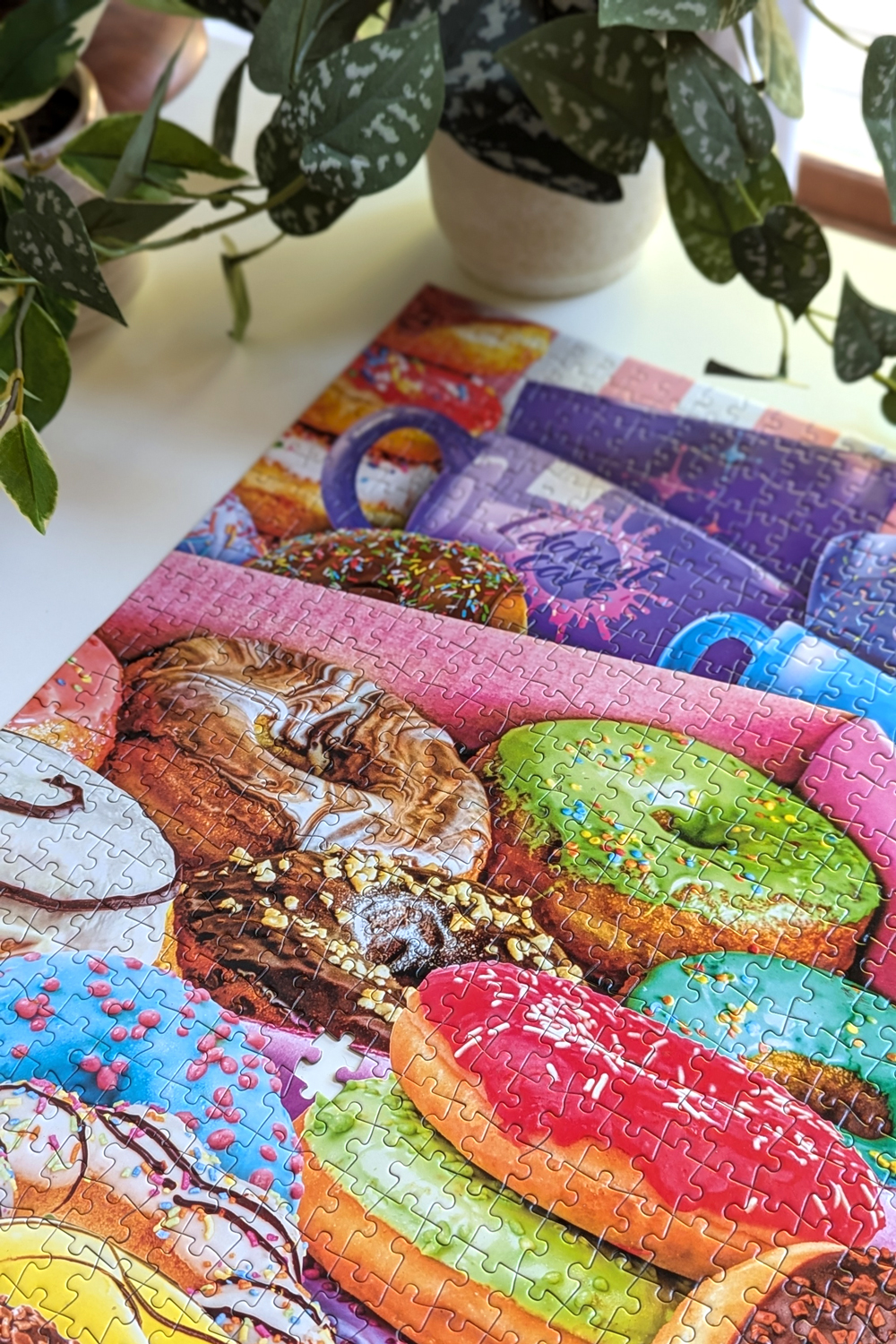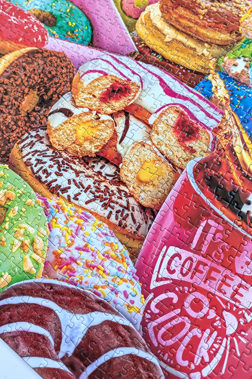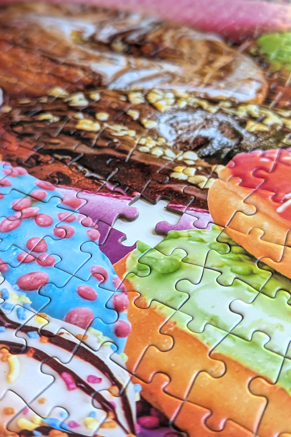 Despite being 1500 pieces, my husband and I finished this puzzle in about 7.5 hours. While I was the primary puzzler, my husband joined in for several longer sessions, and it felt like we flew through this puzzle. I started with a full color sort, pulling out the larger sections of color without trying to sub-sort right away. After sorting, the edge came together quickly, and I decided to start with sections that had the smallest or most distinct textures (like the teal frosted donut and blues, or one of the brown sprinkles donuts). From there, I moved from one color to the next, pulling the entire color in front of me and sub-sorting the textures.