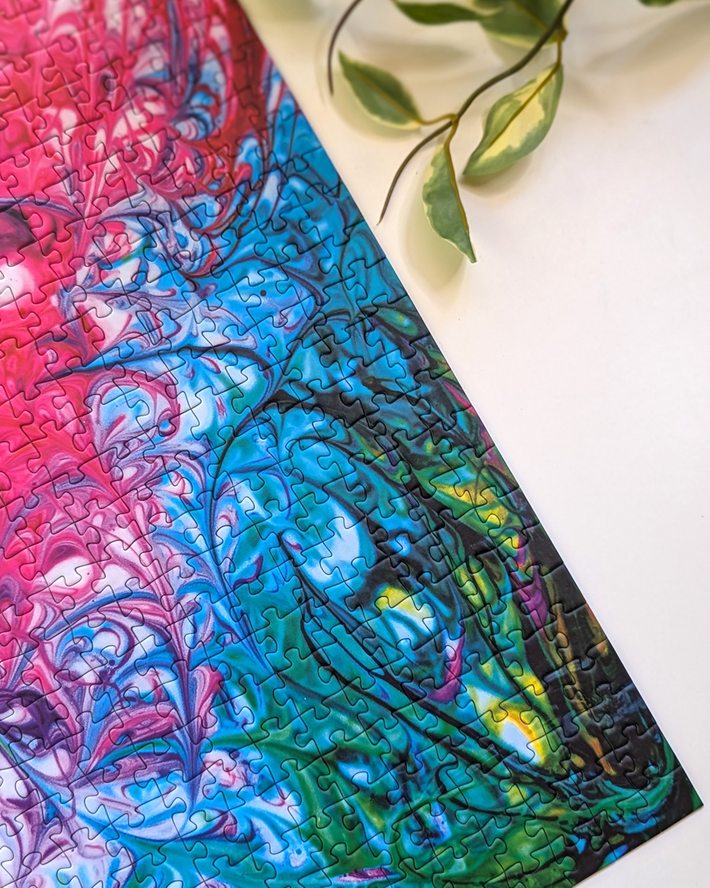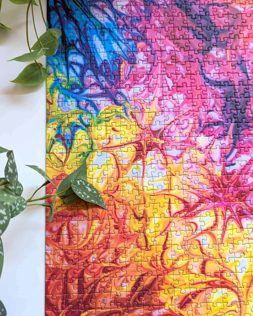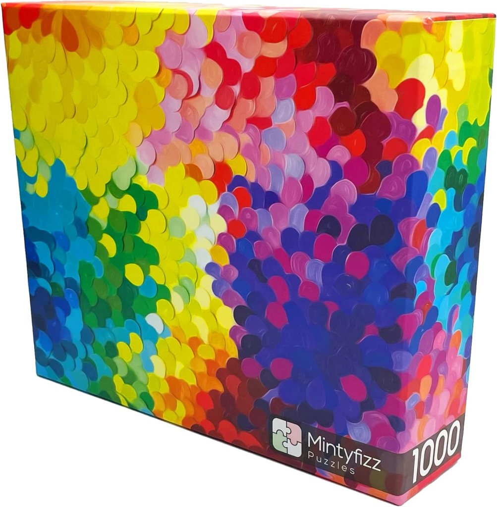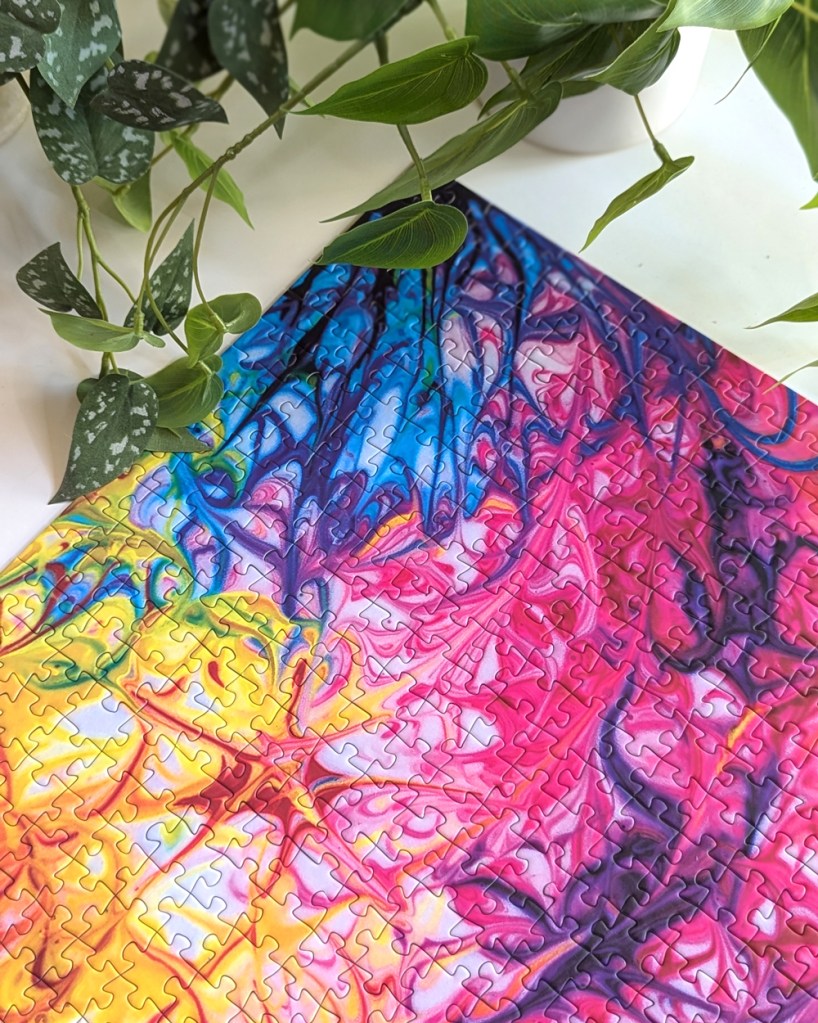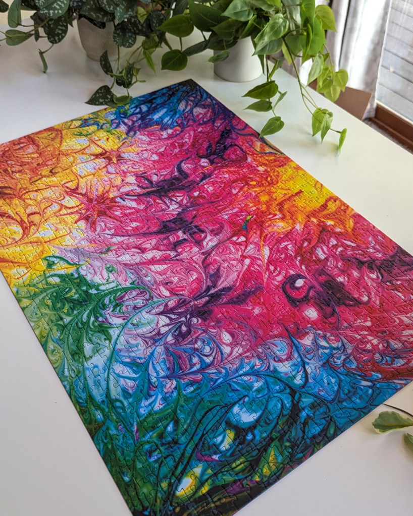 This is “Joy Waves,” a colorful 1,000-piece puzzle by Mintyfizz Puzzles. Aptly named, this image is truly a joy to look at. With its bright waves of color swirling and mixing together, it’s hard not to love this design. @lost_in_geek_reviews started this puzzle as a traveling puzzle a couple of months ago, and I was lucky enough to be selected to receive it after @gottajustpuzzle had it last month. I was really excited to be chosen because I’ve been wanting to try a Mintyfizz Puzzle for a while now.
