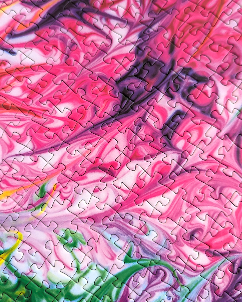 I was about three-quarters of the way through the puzzle when my husband returned from his trip. He looked at it and said, “You know you’ve got that upside down.” Sure enough, when I checked the box, I realized he was right. 🤦♀️ Whoops! I decided to just leave it as it was while recording the time-lapse, and in the end, I embraced it. So, all of my photos ended up being of the puzzle upside down too. 😂 That’s one of the perks of working on an abstract puzzle image!