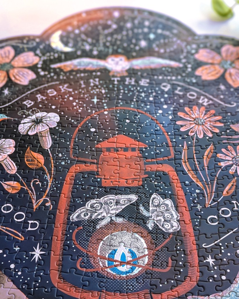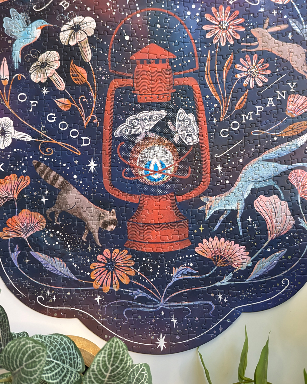 I really loved putting this puzzle together. I started, not with the edge, but with the lantern. I found the pattern around the flame to be the most distinct element as the pieces were so distinct. I was initially worried that the uppercase letters of the quote ‘Bask in the Glow of Good Company’ would be difficult, but the sizing of the letters and unique spacing actually made it rather easy. Oftentimes uppercase letters can be the hardest type to puzzle but as this font had a serif detail and was sized so that the letters really only took up one or two pieces it made each form reasonably easy to identify. If you remembered the quote, it was even easier. The majority of the details came together easily, the animals, the quote and the lantern. I did slow down once I started working on the flowers. The pink flowers ended up being the most challenging element besides the stars which I left to the end. Once the majority of details were assembled, I switched to the edge and when done, I finally I filled in the stars.