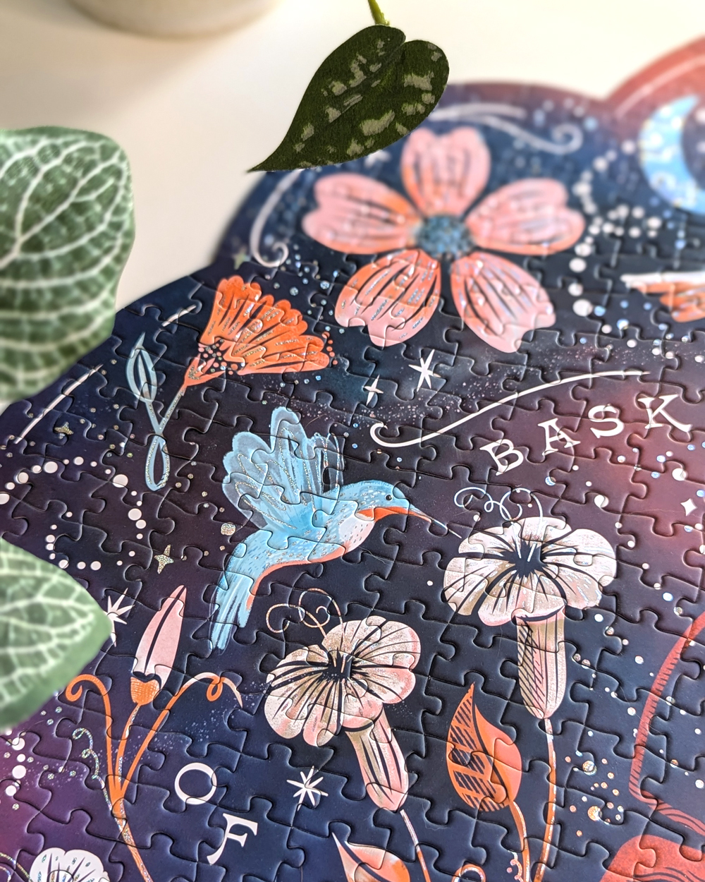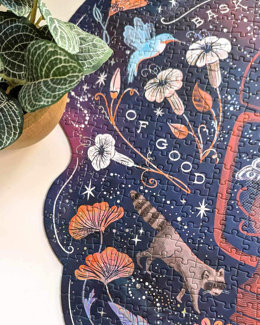 The day this collection came out, all of the designs immediately went onto my TBA list (To Be Assembled). I think they did such a lovely job designing this whole collection. The images are all bright and colorful (even this reasonably dark design). Several have foil details, and many have fun, shaped edges. The designs they created actually look enjoyable to puzzle with lots of variety of element shapes and smart usage of patterns and colors. The puzzle itself comes on a nice thick puzzle blue board. The image is printed with soy inks on FSC certified paper—this means that the paper comes from forests that are managed responsibly and sustainably. The finish on the pieces is smooth and thankfully, not glossy so lighting glares weren’t an issue. The foil detailing was done well, highlighting many of the stars and adding extra interest to the flowers and foliage. I especially liked the touches in the blue fur of the fox.